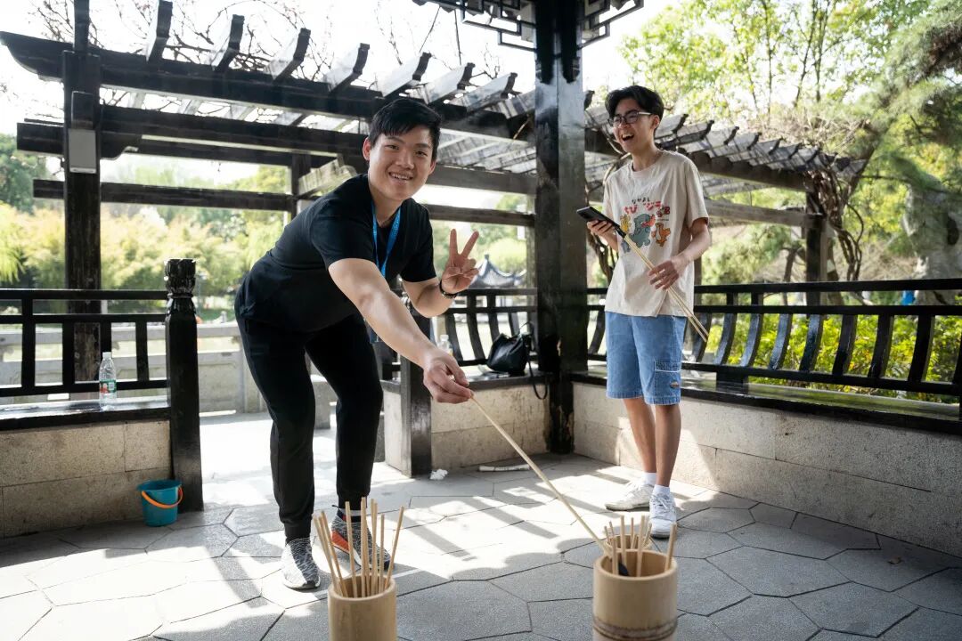 初春在哪里看梅花?答案当然是梅园。海宁梅园公园不仅是闹中取静的赏梅胜地,其独特的布景、古典的亭台,也让人从中一窥江南园林文化的风采。国际生们来到此地,开展中国传统游戏——投壶。