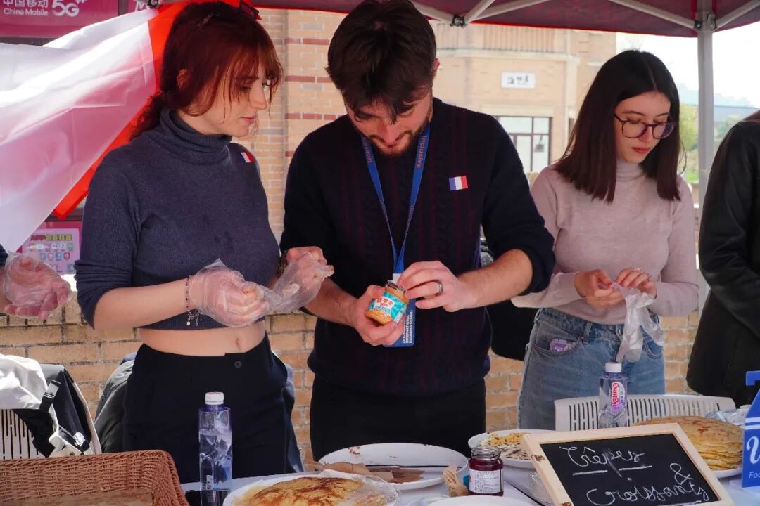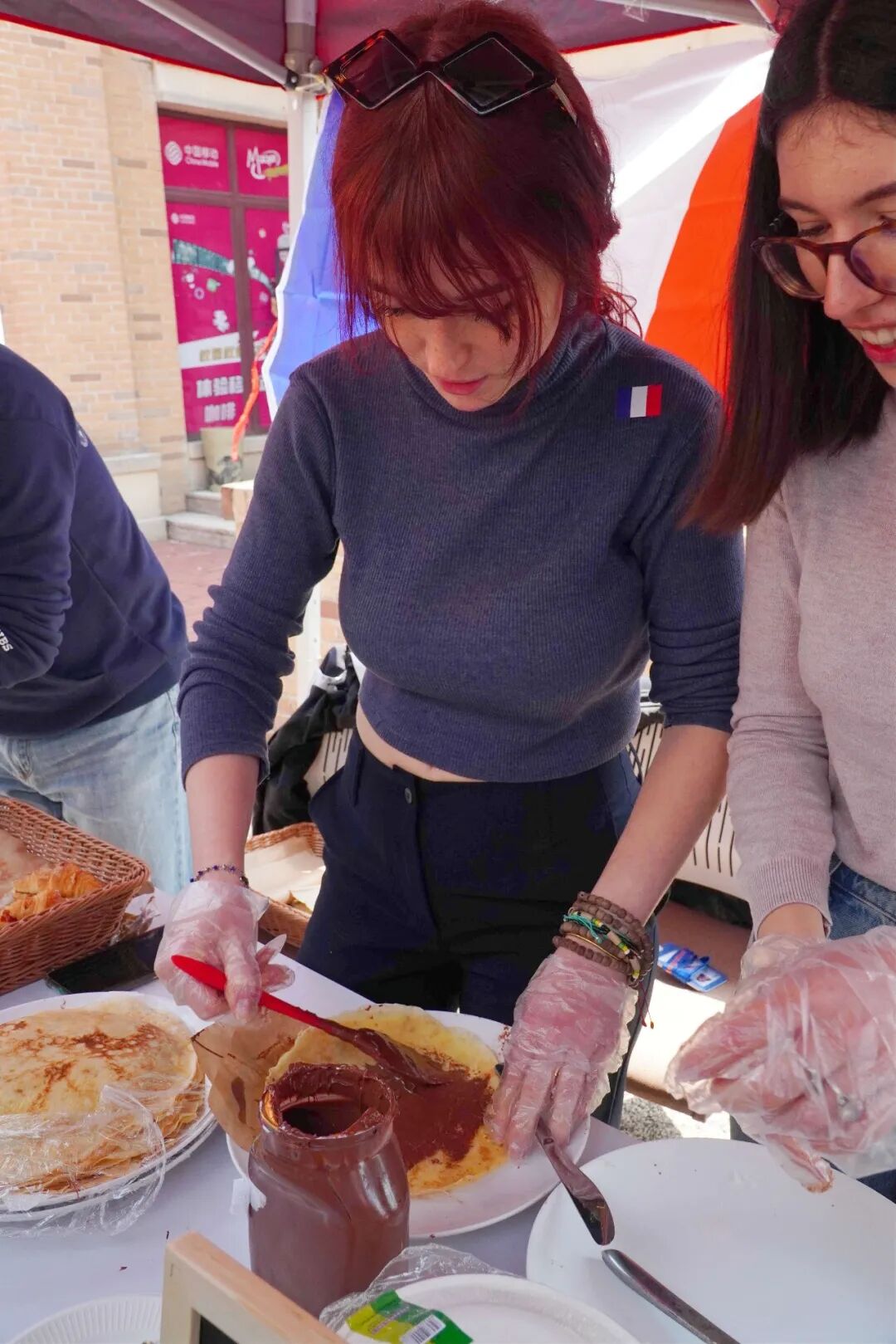 在法国展位,你可以通过卡片游戏了解法国各类美食、美酒的产地,根据法国著名景点了解法国地理分布,也可以现场品尝法国学生准备的黄油可颂,简单的可丽饼配上巧克力榛子酱或花生酱也可以很美味。